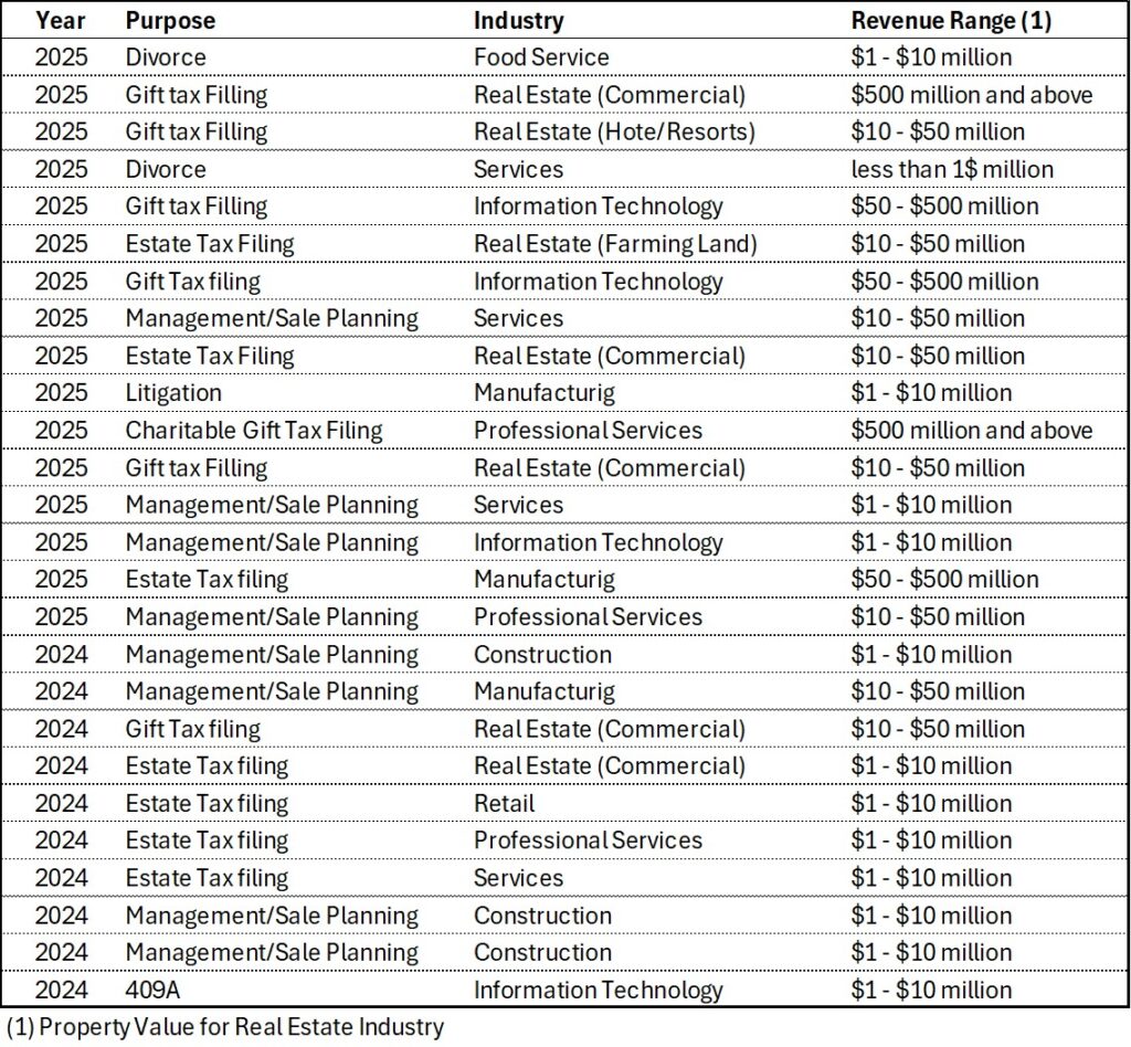 Luis V. Gato performs valuations on an ongoing basis. Please see below a list of recent valuation engagements. Mr. Vale de Gato is also an Affiliated Consultant to Towne Advisory Services Corporation for Valuations.